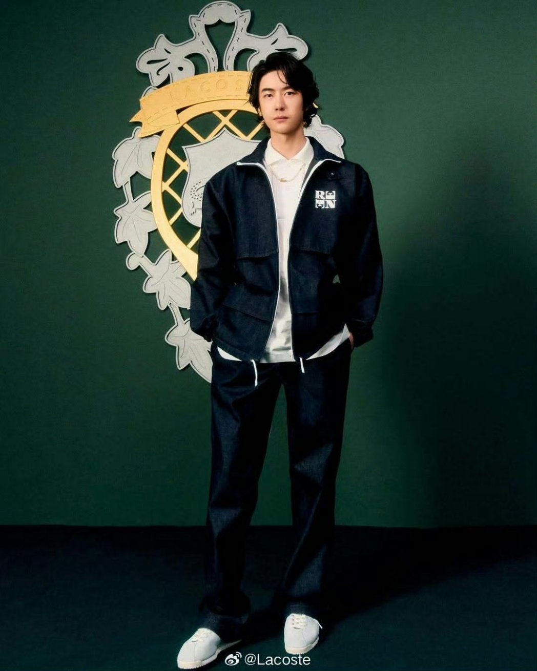 សម្រាប់កម្មវិធី Lacoste Yibo ពាក់អាវក្រៅខ្មៅពីលើអាវពណ៌ស គូជាមួយខោពណ៌ខ្មៅរលុង។ គាត់បានបញ្ចប់រូបរាងជាមួយនឹងស្បែកជើងពណ៌ស្រាលមួយគូ និងខ្សែក មើលទៅសង្ហាដូចរាល់ដង។