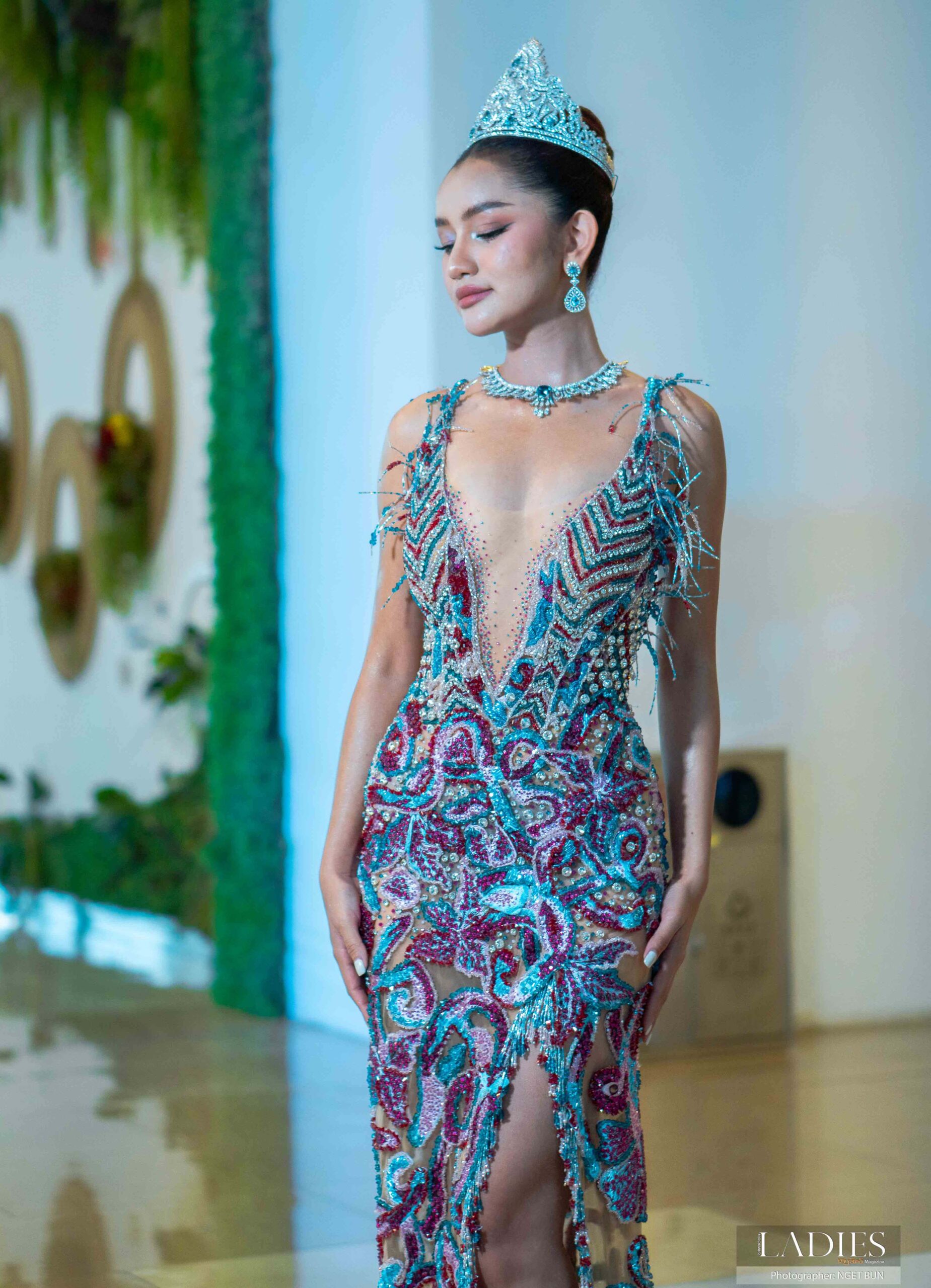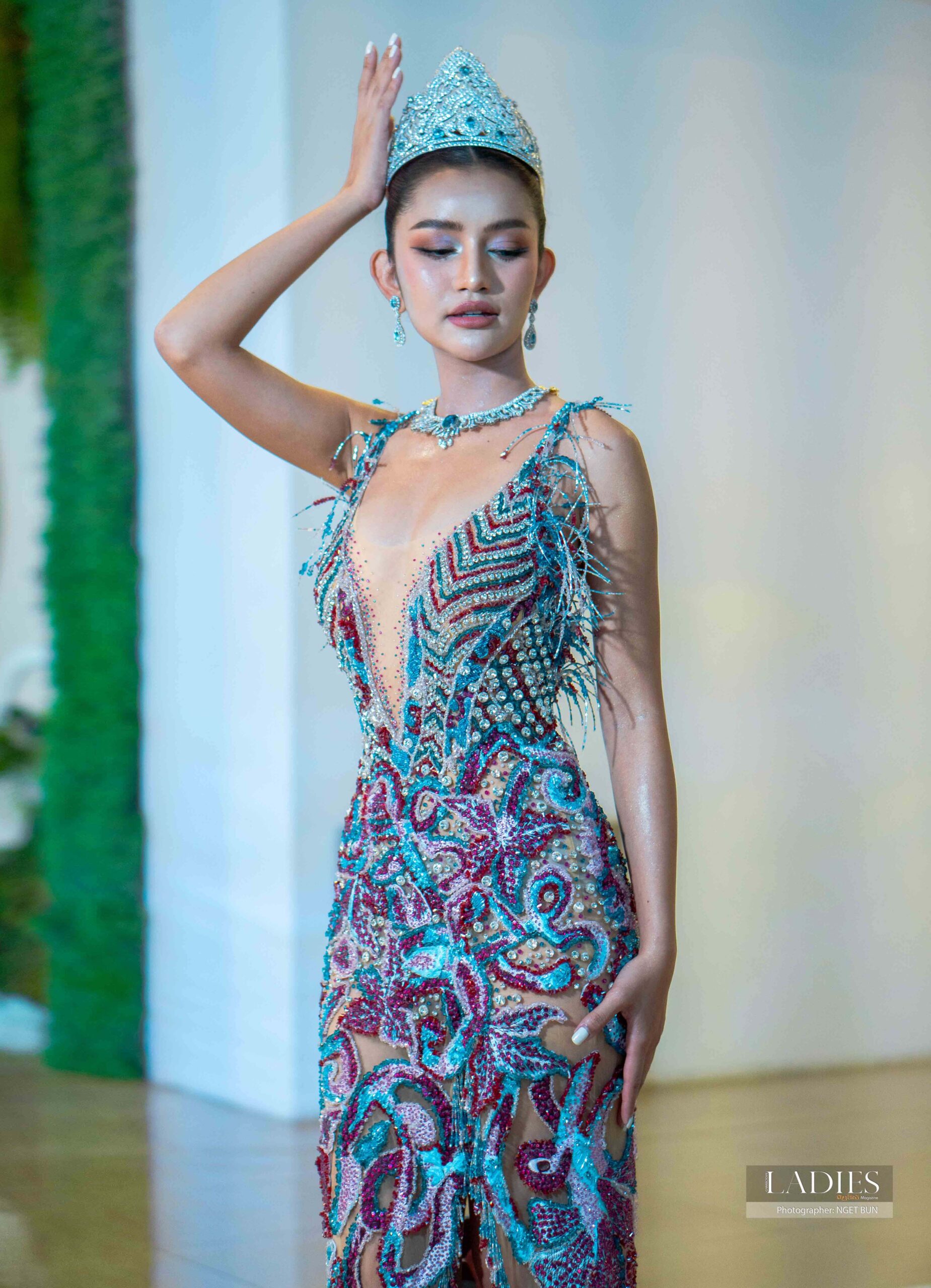 មកុដពេជ្រដ៏ស្រស់ស្អាតយកតាមរចនាបទប្រាសាទព្រះវិហារ ពាក់ដោយ កញ្ញា សំណាង អេលីណា បង្ហាញខ្លួនម្សិលមិញ ជាមួយខ្សែកពេជ្រដ៏មានតម្លៃ ក្នុងនាមជា ម្ចាស់ជ័យលាភី Miss International 2024។