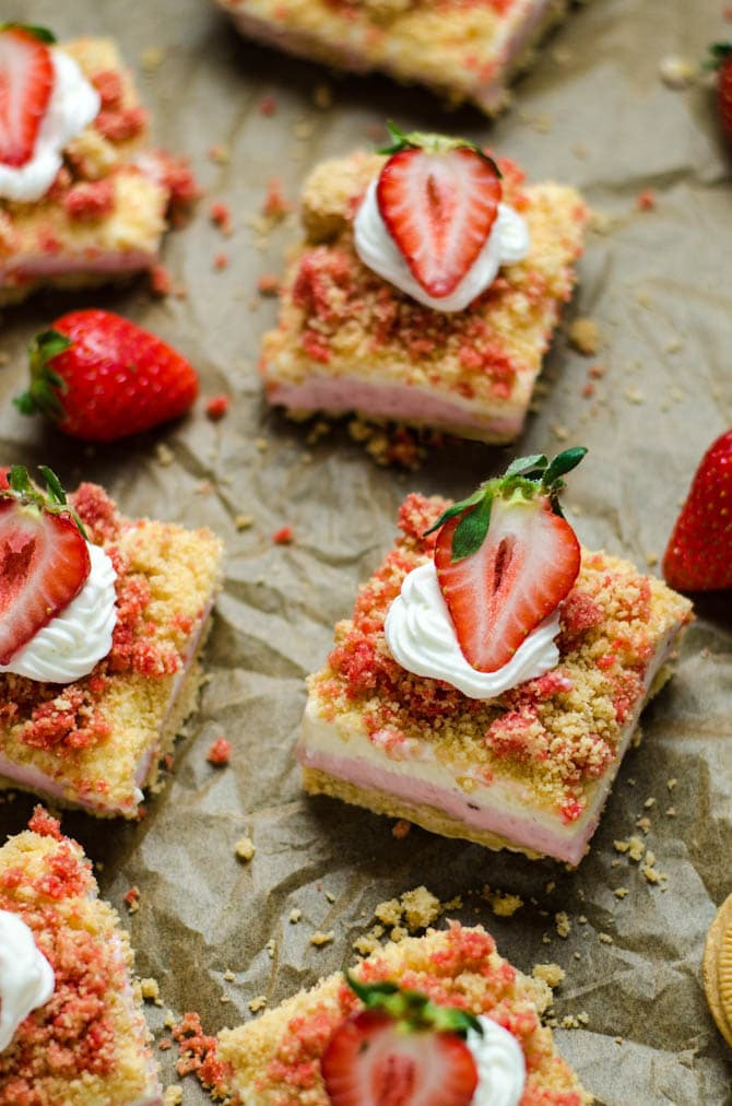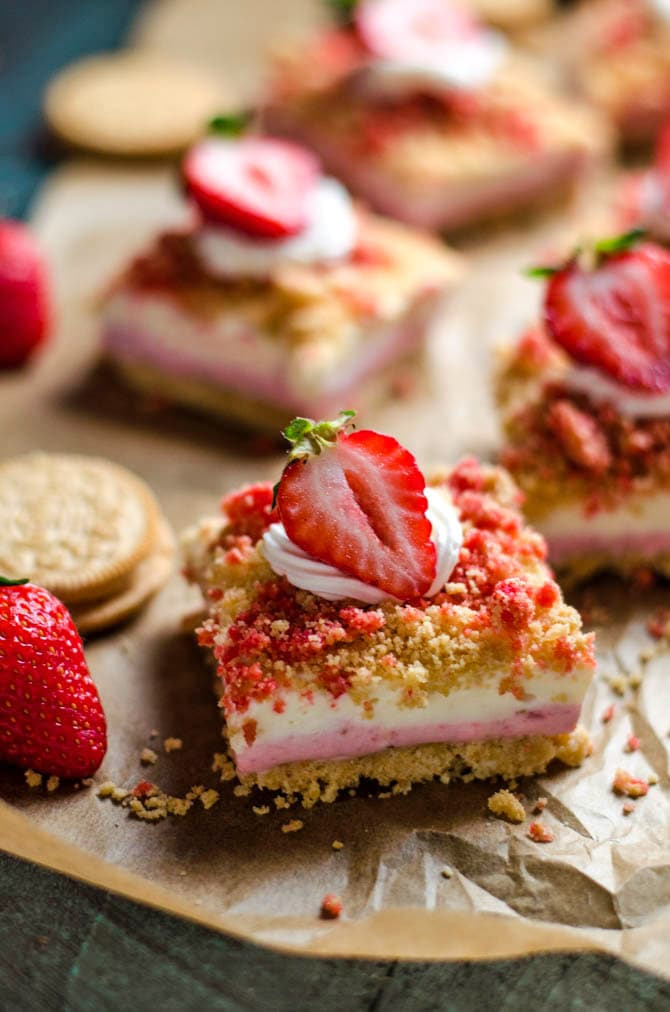 In a medium bowl, combine the gluten-free flour, granulated sugar, brown sugar, salt, and butter. Using your hands or a pastry blender, combine the mixture until it resembles coarse crumbs. Sprinkle the crumb mixture over the cheesecake filling in an even layer. Bake the bars at 350° for 35-45 minutes, or until they are no longer jiggly in the center. If the top isn’t brown enough, just use the broiler for a minute or two to get it lightly golden. Cool the cheesecake to room temperature and then place into the refrigerator to chill for at least 2 hours before cutting into bars. The bars will keep in the refrigerator for up to 4 days.