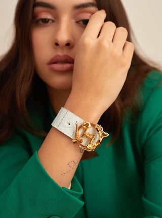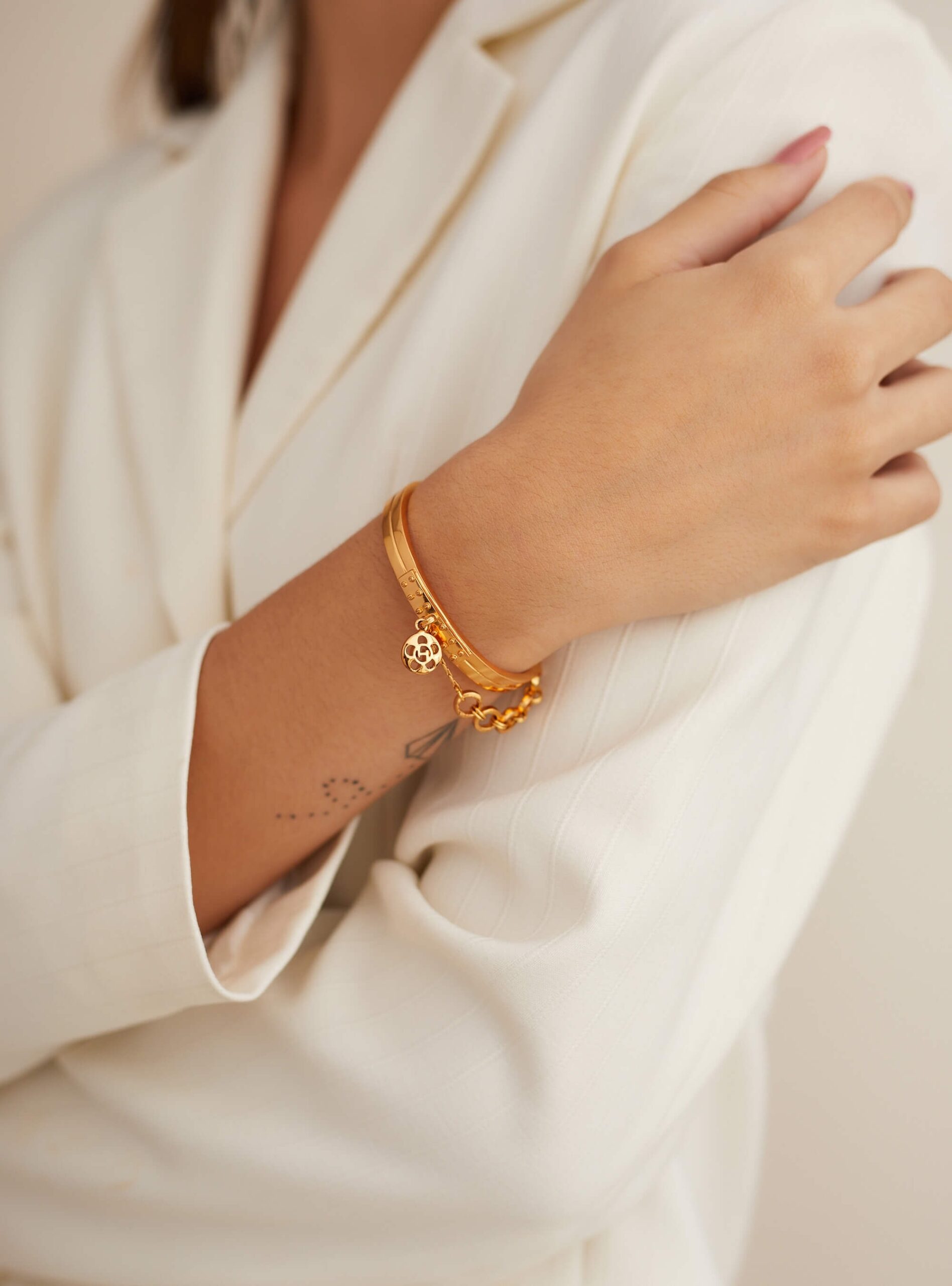 Cuffs have a voice loud enough to be heard on their own, so wear them proudly and do them justice; a cuff should be the sole thing your arm is adorned with. There are several kinds of cuffs out there: silver, gold, adorned with jewels, covered in floral stamps, pearl incrusted, wood, leather and even animal shapes. Whatever style you chose to make your own, keep the rest of the jewelry to an absolute minimum and check in the with the color of our shoes mirror to see that your cuff goes and compliments-not clashes with-your top.