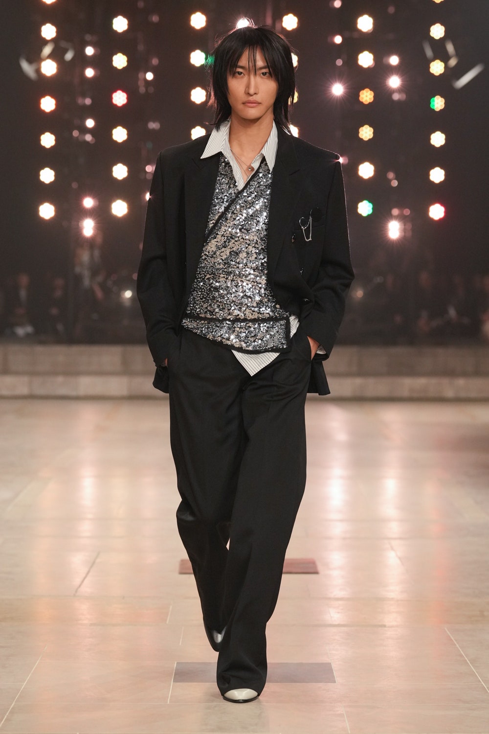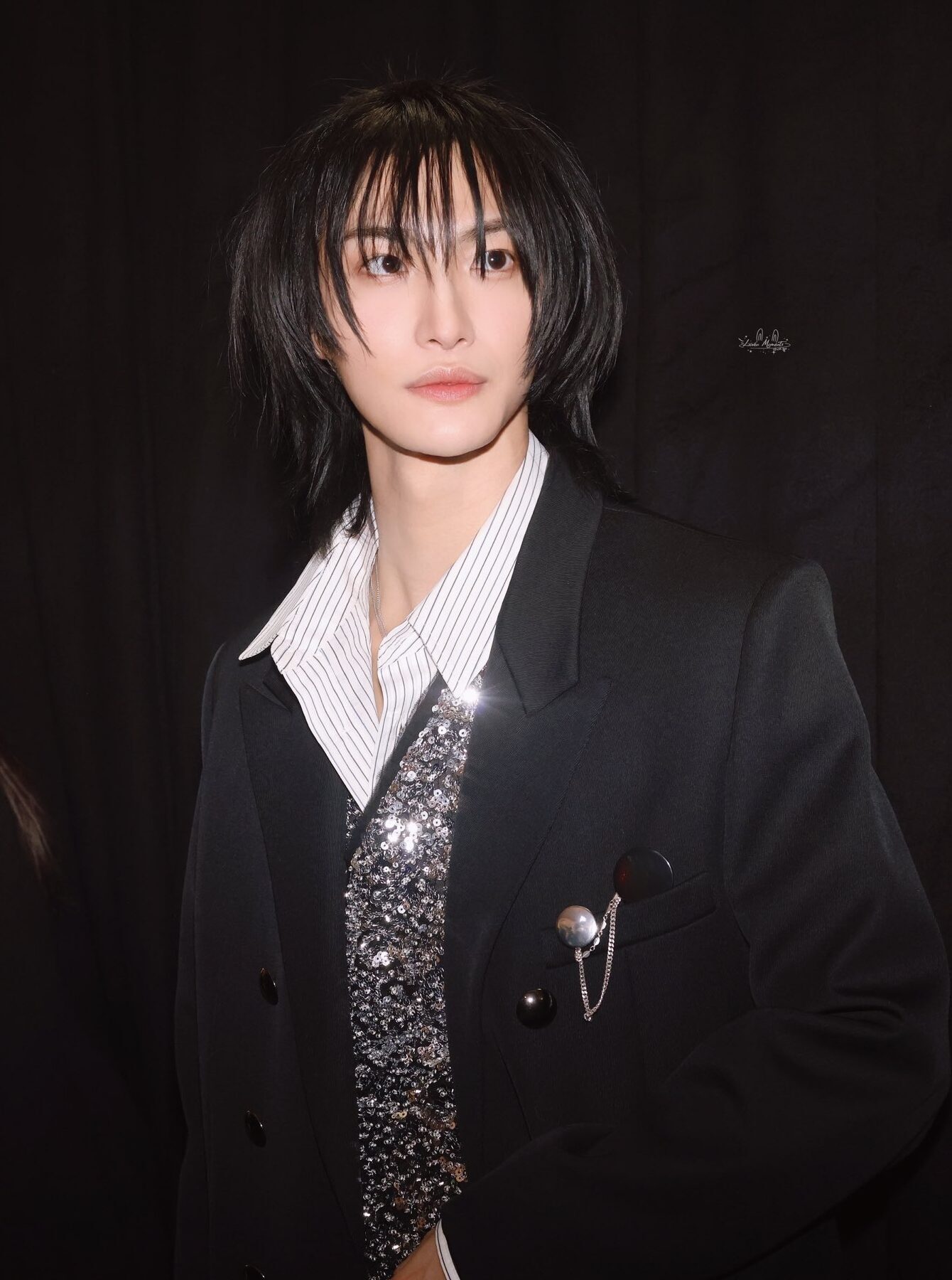 Seonghwa showcasing the look from Isabel Marant’s Fall/Winter 2025 collection. Known for his distinct style and stage presence, he effectively embodies the chic and edgy elements of the outfit, enhancing the overall aesthetic of the collection. His long hair and confident walk contribute to the dramatic flair of the runway presentation.
