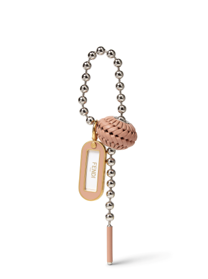 Fendi Handbag Charms ក៏មាន Pendant រួមបញ្ចូលគ្នាផងដែរ វាគឺជាទម្រង់ខ្សែសង្វាក់ដែលចងជាប់គ្នាជាមួយនឹងកូនបាល់ធ្វើពីស្បែក និងបំពាក់ស្លាកឈ្មោះម៉ាកយីហោធ្វើពីមាស។ Pendant មានពណ៌ផ្កាឈូក ដើម្បីតំណាងរដូវកាលនេះ… រីឯក្រដាស់ស្លាកឈ្មោះម៉ាកយីហោវិញ មានហ៊ុំព័ទ្ធស៊ុមជុំវិញ។