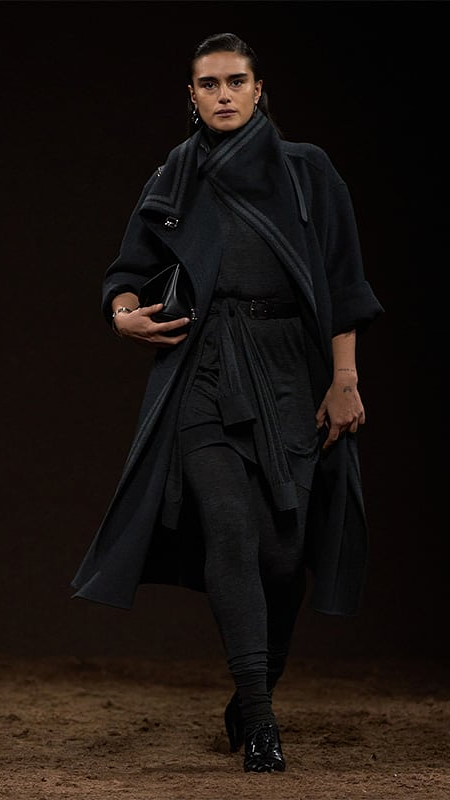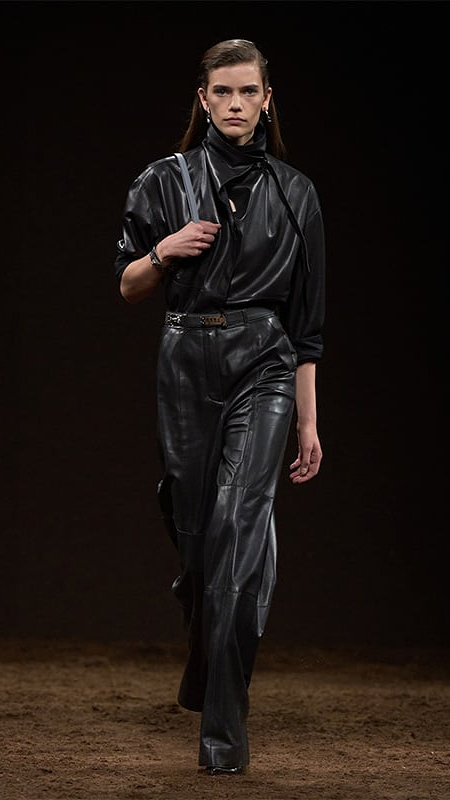 អ្នករចនា Nadège Vanhee ដែលជានាយកច្នៃប្រឌិតរបស់ Hermès បានដាក់បង្ហាញ ឈុតស្បែកពណ៌ខ្មៅរលោងភ្លឺចែងចាំង ដែលបង្កប់នូវភាពទំនើបមិនចេះចប់មិនចេះហើយ និងពោរពេញដោយថាមពលឈ្ពោះទៅមុខ។ កា