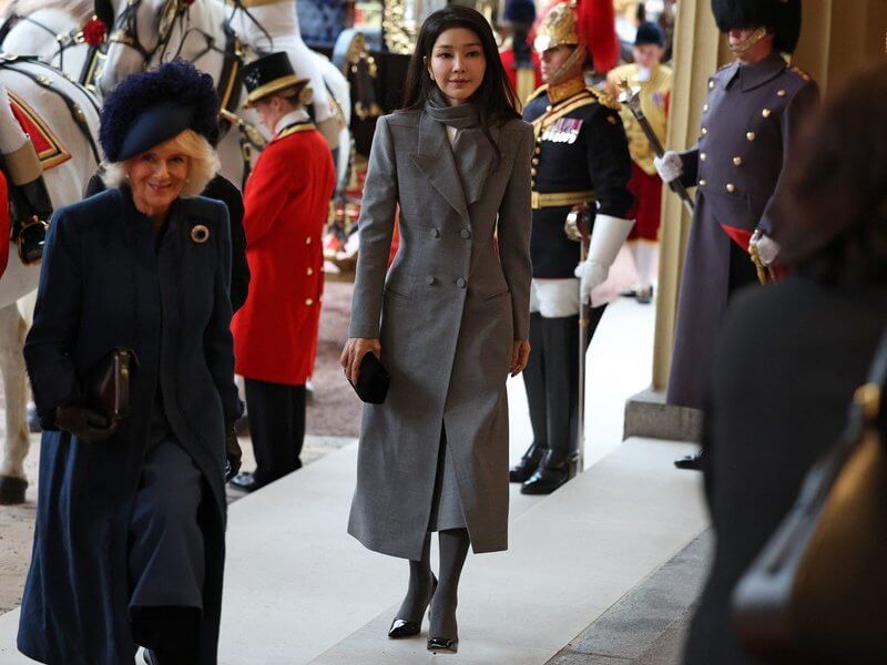 លោកស្រី Kim Keon-hee បានធ្វើដំណើរជាមួយលោកប្រធានាធិបតី ទៅកាន់ចក្រភពអង់គ្លេស កាលពីឆ្នាំ 2023 កន្លងទៅ នៅក្នុងដំណើរទស្សនកិច្ចផ្លូវការ ដែលក្នុងនោះមានជំនួបជាមួយនឹងមហាក្សត្រអង់គ្លេស។ នៅក្នុងដំណើរទស្សនកិច្ចនោះ គេសង្កេតឃើញសម្លៀកបំពាក់ស្រ្តីទី១ រូបនេះ មានភាពប្រណិត ផ្លូវការ និង ស៊ីវិល័យ។ នៅក្នុងរាជវាំងអង់គ្លេស Buckingham Palace ស្រ្តីទី១ បានជ្រើសរើសស្លៀករ៉ូបពណ៌ខ្មៅ យ៉ាងប្រណិតបំផុត ក្នុងជំនួបជាមួយនឹងស្តេច King Charles។