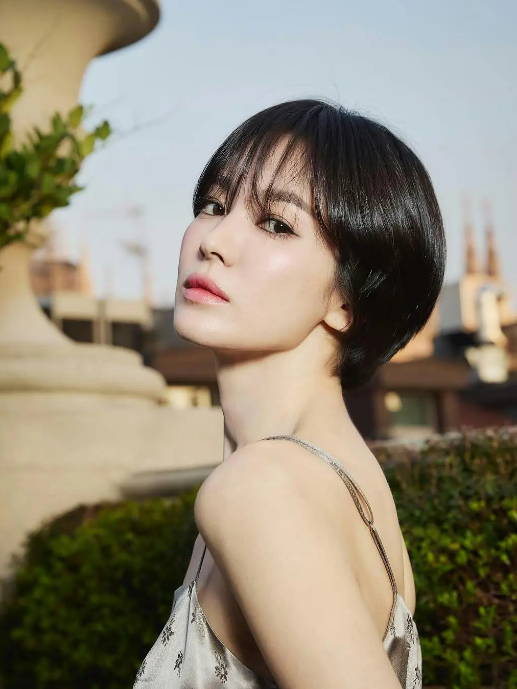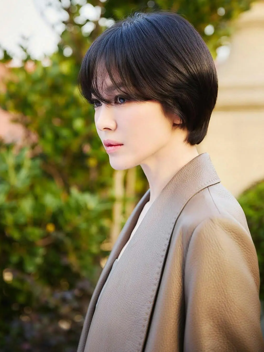 Song Hye Kyo ហាក់ចាយសម្រស់ដ៏ទាក់ទាញជាមួយនឹងម៉ូតសក់ខ្លី និងម៉ូតសក់សេះទម្លាក់មកខាងមុខបាំងថ្ងាស់ មើលទៅឃើញផ្ទៃមុខតូច ពិតជាស្រស់ស្អាតយ៉ាងខ្លាំង។